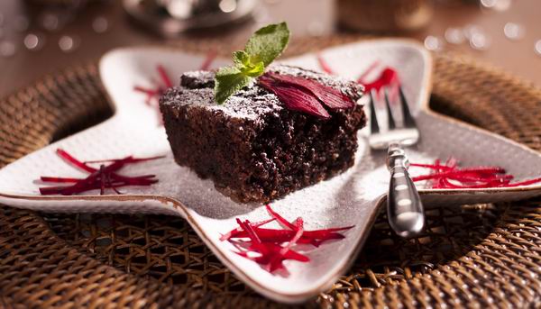 A céklákat megtisztítjuk, apró darabokra vágjuk, és puhára főzzük. Amint kihűl a cékla darabokat, az olvadt vajjal simára dolgozzuk botmixer segítségével. A tojások sárgáját a xilitet habosra keverjük, majd a céklás masszával elegyítjük. A száraz hozzávalókat is hozzáadjuk, majd a tojások felvert habjával lazítjuk, végül belekeverjük a durvára aprított csokoládét. Sütőpapírral bélelt tepsibe öntjük a masszát és 160 fokra előmelegített sütőben 60-75 perc alatt készre sütjük.