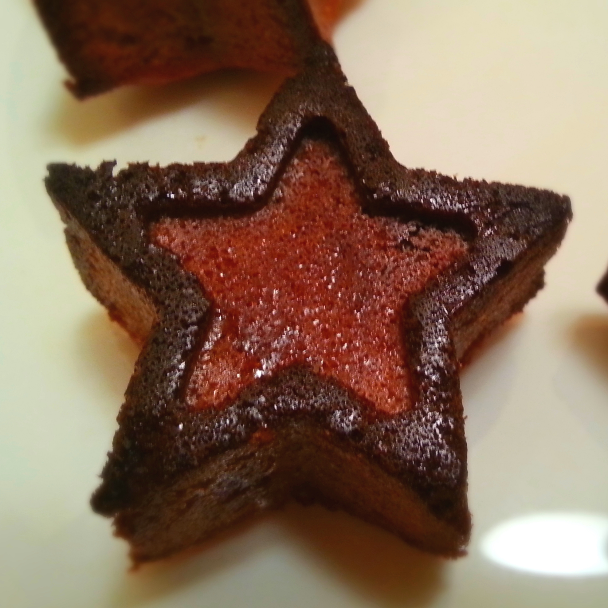 Összekeverjük a tojásokat a cukorral, felolvasztott vajjal, majd apránként hozzáadjuk az átszitált liszteket és a sütőport. Annyi tejet öntünk hozzá, hogy muffin tészta sűrűségű masszát kapjunk. Végül hozzákeverjük az apró darabokra tört étcsokoládét. A tésztát csillag formájú szilikonos formába adagoljuk, és 180 fokra előmelegített sütőben aranybarnára sütjük kb. 30 perc alatt.