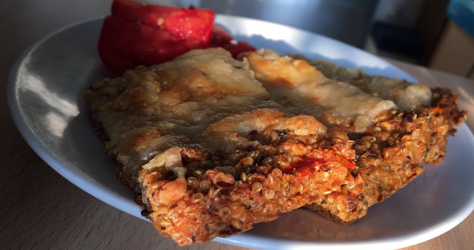 A quinoát kétszer annyi sóval, borssal ízesített vízben feltesszük főni. Közben a paradicsomot apró kockákra vágjuk, fokhagymanyomón átnyomjuk fokhagymagerezdeket és egy teáskanálnyi olíva olajon, alacsony hőfokon pirítjuk őket. Amikor megfőtt a quinoa belekeverjük a paradicsomot és a hagymát, majd hagyjuk kihűlni. Közben lereszeljük a sajtot, felverjük a tojást és ízesítjük fűszerekkel. Amikor kihűlt a quinoa hozzáteszünk egy evőkanál lenmagpelyhet. A tojásba belekeverjük a sütőport, hozzáöntjük a quinoához és összedolgozzuk őket. Egy közepes méretű tepsibe sütőpapírt helyezünk, majd egyenletesen vékonyan eloszlatjuk benne a masszát. Előmelegített sütőben 150°C-on kb. 15 percig sütjük, majd ráhelyezzük a sajtot és tovább sütjük még kb. 5 percig. Mielőtt felszeleteljük, hagyjuk kicsit kihűlni. Tálalhatjuk önmagában, különféle mártogatóssal vagy akár pizza alapjaként is szolgálhat.