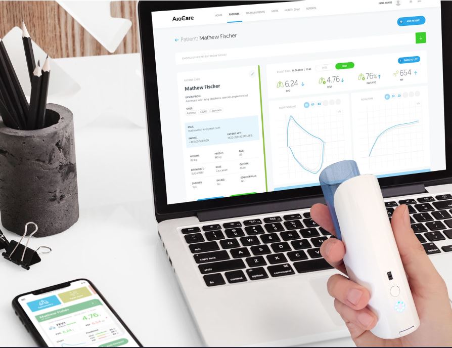 Az AioCare egy professzionális rendszer a tüdőbetegségek monitorozására, amely egy hordozható spirométerből, egy beépített szívritmusmérőből, illetve egy okostelefonra letölthető online kezelőfelületből áll. A spirométer monitorozza a kilégzési-, illetve belégzési görbéket és valós időben megjeleníti a legfontosabb paramétereket az okostelefon kijelzőjén. A mérés végeztével adatait interneten keresztül könnyedén megoszthatja kezelőorvosával.